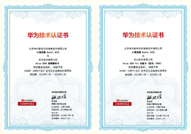 近期,evo视讯官网KunTai A722服务器顺利获得华为“Atlas 300V 视频解析卡”以及“Atlas 300T Pro 训练卡(型号:9000)”两项技术认证,为智能算力再添新力!